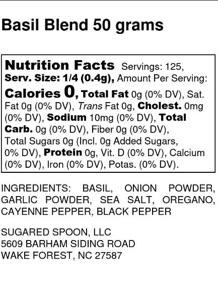 Basil, Onion Powder, Garlic Powder, Sea Salt, Oregano, Cayenne Pepper, Black Pepper